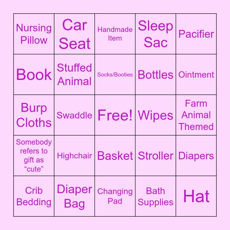 This bingo card has a free space and 36 words: Toy, Towel, Teether, Stuffed Animal, Stroller, Somebody refers to gift as “cute”, Socks/Booties, Sippy Cup, Pacifier, Onesie, Swaddle, Sleep Sac, Sound Machine, Wipes, Ointment, Nursing Pillow, Holstein Print, Highchair, Hat, Handmade Item, Farm Animal Themed, Diapers, Diaper Bag, Crib Bedding, Changing Pad, Car Seat, Burp Cloths, Bows, Bottles, Book, Blanket, Bibs, Bath Supplies, Basket, Baby Monitor and Anything Pink.