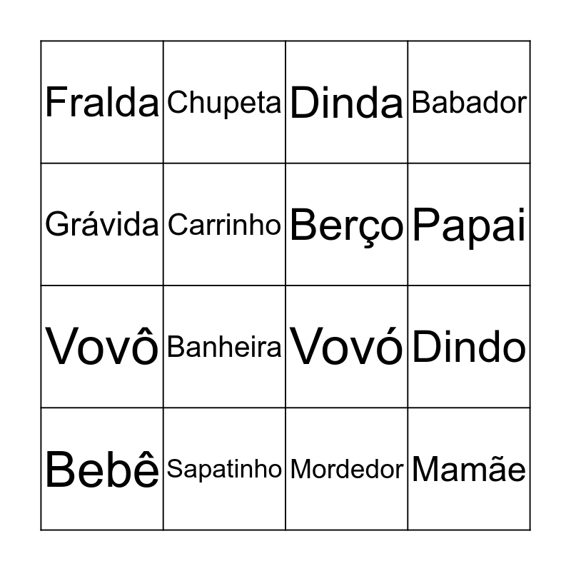 This bingo card has a free space and 15 words: Bebê, Mamãe, Dinda, Fralda, Papai, Grávida, Banheira, Mordedor, Carrinho, Vovô, Dindo, Babador, Berço, Chupeta and Sapatinho.