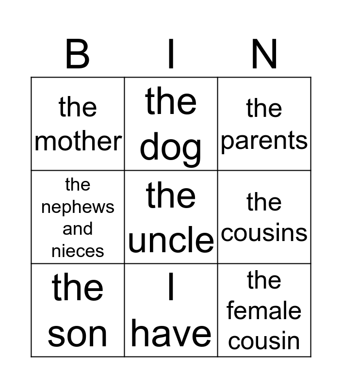 This bingo card has 29 words: the family, big, small, the father, the mother, the parents, the son, the daughter, the children, the brother, the sister, the siblings, the grandfather, the grandmother, the grandparents, the grandson, the granddaughter, the grandchildren, the uncle, the aunt, the uncles and aunts, the male cousin, the female cousin, the cousins, the nephews and nieces, the dog, the cat, I have and my.