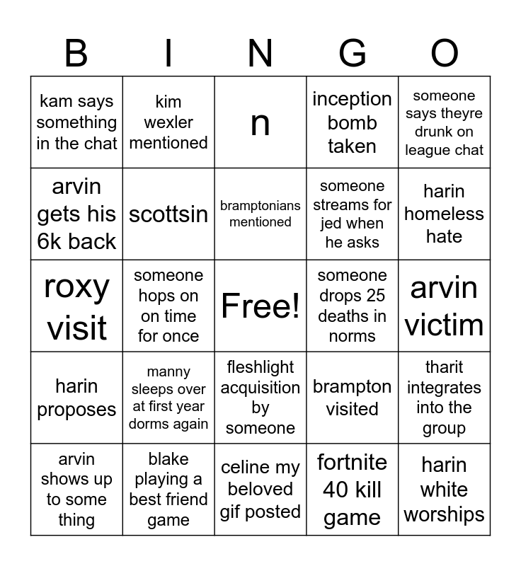 This bingo card has a free space and 24 words: manny sleeps over at first year dorms again, blake playing a best friend game, bramptonians mentioned, arvin shows up to some thing, someone says theyre drunk on league chat, kam says something in the chat, arvin gets his 6k back, kim wexler mentioned, someone drops 25 deaths in norms, fleshlight acquisition by someone, someone streams for jed when he asks, roxy visit, brampton visited, tharit integrates into the group, scottsin, fortnite 40 kill game, arvin victim, n, harin homeless hate, someone hops on on time for once, harin white worships, harin proposes, inception bomb taken and celine my beloved gif posted.