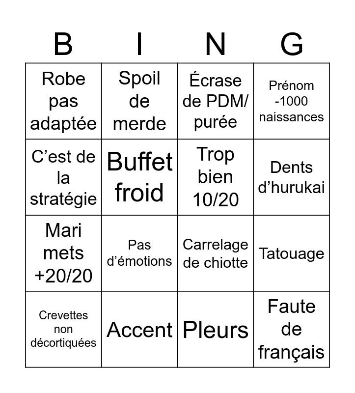 This bingo card has 16 words: Accent, Tatouage, Écrase de PDM/ purée, Robe pas adaptée, Mari mets +20/20, Spoil de merde, Carrelage de chiotte, Pleurs, C’est de la stratégie, Buffet froid, Crevettes non décortiquées, Prénom -1000 naissances, Pas d’émotions, Dents d’hurukai, Trop bien 10/20 and Faute de français.