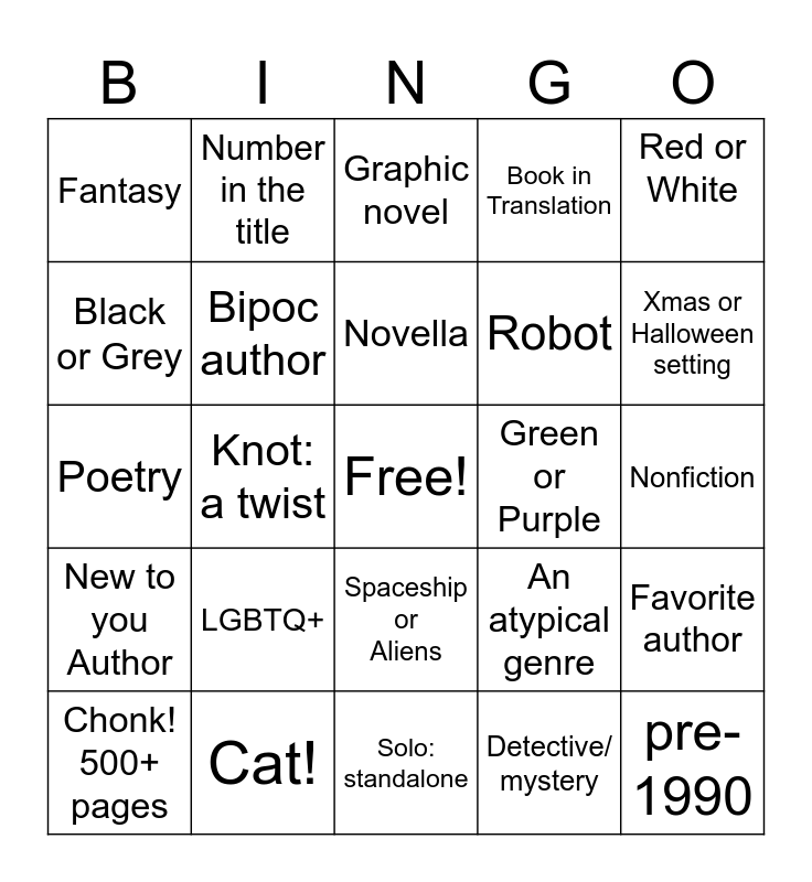 This bingo card has a free space and 24 words: LGBTQ+, Cat!, Novella, Chonk! 500+ pages, Red or White, Fantasy, Black or Grey, Number in the title, Green or Purple, Spaceship or Aliens, Robot, Poetry, An atypical genre, Favorite author, Bipoc author, Detective/ mystery, Nonfiction, Graphic novel, Xmas or Halloween setting, Knot: a twist, pre-1990, New to you Author, Book in Translation and Solo: standalone.