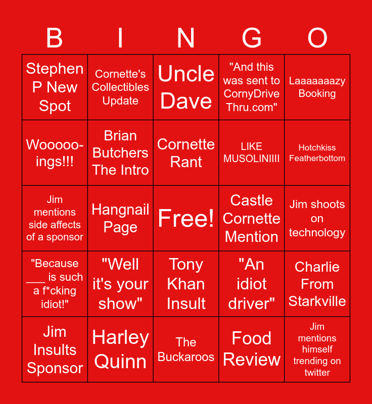 This bingo card has a free space and 24 words: "Well it's your show", Harley Quinn, Cornette Rant, Jim Insults Sponsor, Laaaaaaazy Booking, Stephen P New Spot, Wooooo-ings!!!, Cornette's Collectibles Update, Castle Cornette Mention, Tony Khan Insult, LIKE MUSOLINIIII, Jim mentions side affects of a sponsor, "An idiot driver", Charlie From Starkville, Brian Butchers The Intro, Food Review, Jim shoots on technology, Uncle Dave, Hotchkiss Featherbottom, Hangnail Page, Jim mentions himself trending on twitter, "Because ___ is such a f*cking idiot!", "And this was sent to CornyDrive Thru.com" and The Buckaroos.