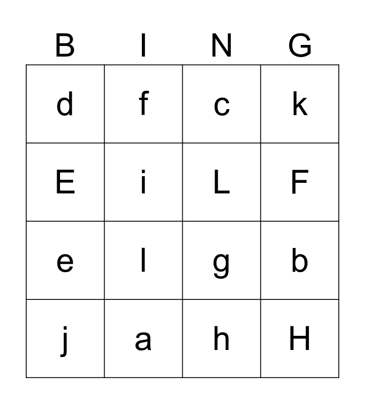 This bingo card has 16 words: a, b, c, d, e, f, g, h, E, i, j, k, l, F, L and H.