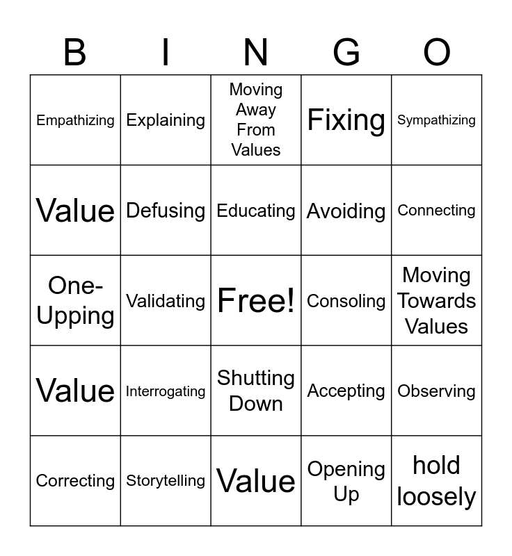 This bingo card has a free space and 24 words: Interrogating, Storytelling, Educating, Correcting, Sympathizing, Empathizing, Value, Explaining, Consoling, Shutting Down, Avoiding, One-Upping, Accepting, Observing, Defusing, Opening Up, Moving Towards Values, Moving Away From Values, Connecting, Validating, hold loosely, Value, Fixing and Value.