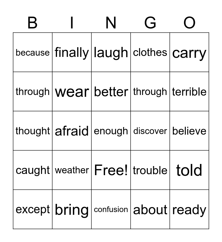 This bingo card has 26 words: Free!, about, better, bring, carry, because, through, finally, believe, trouble, through, thought, told, except, afraid, decide, clothes, caught, laugh, enough, terrible, confusion, discover, weather, wear and ready.