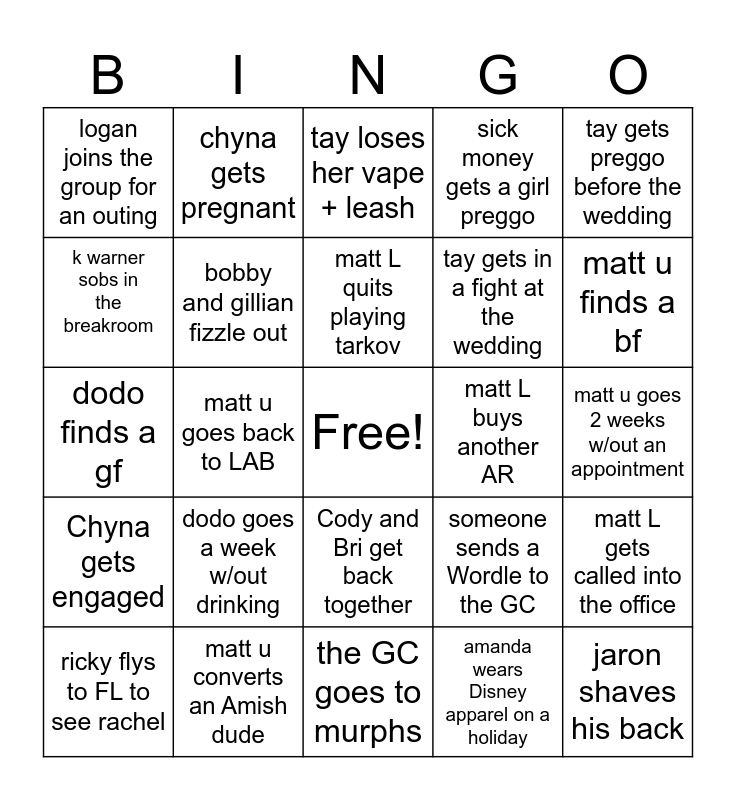 This bingo card has a free space and 24 words: dodo goes a week w/out drinking, matt u converts an Amish dude, matt L quits playing tarkov, ricky flys to FL to see rachel, tay gets preggo before the wedding, logan joins the group for an outing, k warner sobs in the breakroom, chyna gets pregnant, matt L buys another AR, Cody and Bri get back together, tay gets in a fight at the wedding, dodo finds a gf, someone sends a Wordle to the GC, matt L gets called into the office, bobby and gillian fizzle out, amanda wears Disney apparel on a holiday, matt u goes 2 weeks w/out an appointment, tay loses her vape + leash, matt u finds a bf, matt u goes back to LAB, jaron shaves his back, Chyna gets engaged, sick money gets a girl preggo and the GC goes to murphs.