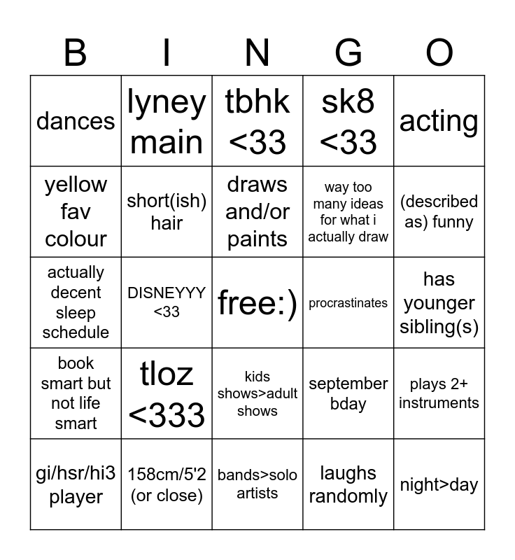 This bingo card has a free space and 24 words: gi/hsr/hi3 player, tloz <333, draws and/or paints, laughs randomly, acting, dances, lyney main, tbhk <33, procrastinates, has younger sibling(s), actually decent sleep schedule, short(ish) hair, september bday, plays 2+ instruments, yellow fav colour, 158cm/5'2 (or close), bands>solo artists, sk8 <33, (described as) funny, book smart but not life smart, DISNEYYY <33, kids shows>adult shows, way too many ideas for what i actually draw and night>day.