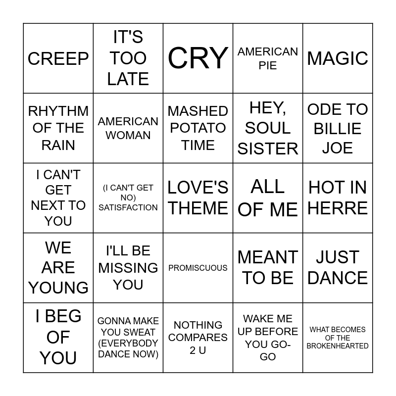This bingo card has 74 words: THE THIRD MAN THEME, HOW HIGH THE MOON, CRY, HOW MUCH IS THAT DOGGIE IN THE WINDOW, HEY THERE, THE YELLOW ROSE OF TEXAS, LISBON ANTIGUA, LITTLE, I BEG OF YOU, PERSONALITY, CATHY'S CLOWN, MICHAEL (ROW THE BOAT ASHORE), MASHED POTATO TIME, RHYTHM OF THE RAIN, HELLO DOLLY, (I CAN'T GET NO) SATISFACTION, WHAT BECOMES OF THE BROKENHEARTED, ODE TO BILLIE JOE, HONEY, I CAN'T GET NEXT TO YOU, AMERICAN WOMAN, IT'S TOO LATE, AMERICAN PIE, KILLING ME SOFTLY WITH HIS SONG, LOVE'S THEME, PHILADELPHIA FREEDOM, DISCO LADY, BEST OF MY LOVE, YOU LIGHT UP MY LIFE, LE FREAK, MAGIC, LADY, I LOVE ROCK 'N ROLL, FLASHDANCE... WHAT A FEELING, SAY SAY SAY, WAKE ME UP BEFORE YOU GO-GO, I MISS YOU, SHAKE YOU DOWN, GOT MY MIND SET ON YOU, EVERY ROSE HAS IT'S THORN, NOTHING COMPARES 2 U, GONNA MAKE YOU SWEAT (EVERYBODY DANCE NOW), JUMP, (I CAN'T HELP) FALLING IN LOVE WITH YOU, I'LL MAKE LOVE TO YOU, CREEP, BECAUSE YOU LOVED ME, I'LL BE MISSING YOU, YOU'RE STILL THE ONE, ANGEL OF MINE, MARIA MARIA, ALL FOR YOU, HOT IN HERRE, GET BUSY, IF I AIN'T GOT YOU, LET ME LOVE YOU, PROMISCUOUS, THE SWEET ESCAPE, NO ONE, JUST DANCE, HEY, SOUL SISTER, FIREWORK, WE ARE YOUNG, RADIOACTIVE, ALL OF ME, SEE YOU AGAIN, ONE DANCE, THAT'S WHAT I LIKE, MEANT TO BE, WITHOUT ME, THE BOX, BLINDING LIGHTS, STAY and KILL BILL.