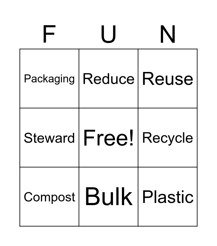 This bingo card has a free space and 8 words: Recycle, Reuse, Reduce, Compost, Packaging, Plastic, Steward and Bulk.