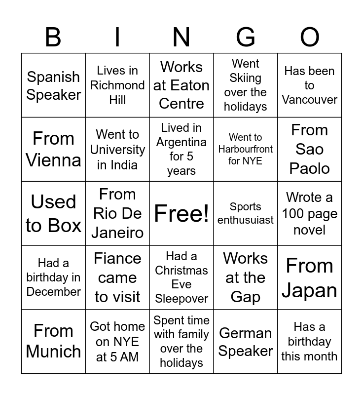 This bingo card has a free space and 24 words: Fiance came to visit, Got home on NYE at 5 AM, Lived in Argentina for 5 years, From Munich, Has been to Vancouver, Spanish Speaker, From Vienna, Lives in Richmond Hill, Sports enthusuiast, Had a Christmas Eve Sleepover, Went to Harbourfront for NYE, Used to Box, Works at the Gap, From Japan, Went to University in India, German Speaker, Wrote a 100 page novel, Works at Eaton Centre, From Sao Paolo, From Rio De Janeiro, Has a birthday this month, Had a birthday in December, Went Skiing over the holidays and Spent time with family over the holidays.