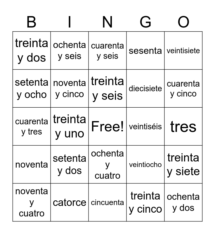 This bingo card has a free space and 100 words: uno, dos, tres, cuatro, cinco, seis, siete, ocho, nueve, diez, once, doce, trece, catorce, quince, dieciséis, diecisiete, dieciocho, diecinueve, veinte, veintiuno, veintidós, veintitrés, veinticuatro, veinticinco, veintiséis, veintisiete, veintiocho, veintinueve, treinta, treinta y uno, treinta y dos, treinta y tres, treinta y cuatro, treinta y cinco, treinta y seis, treinta y siete, treinta y ocho, treinta y nueve, cuarenta, cuarenta y uno, cuarenta y dos, cuarenta y tres, cuarenta y cuatro, cuarenta y cinco, cuarenta y seis, cuarenta y siete, cuarenta y ocho, cuarenta y nueve, cincuenta, cincuenta y uno, cincuenta y dos, cincuenta y tres, cincuenta y cuatro, cincuenta y cinco, cincuenta y seis, cincuenta y siete, cincuenta y ocho, cincuenta y nueve, sesenta, sesenta y uno, sesenta y dos, sesenta y tres, sesenta y cuatro, sesenta y cinco, sesenta y seis, sesenta y siete, sesenta y ocho, sesenta y nueve, setenta, setenta y uno, setenta y dos, setenta y tres, setenta y cuatro, setenta y cinco, setenta y seis, setenta y siete, setenta y ocho, setenta y nueve, ochenta, ochenta y uno, ochenta y dos, ochenta y tres, ochenta y cuatro, ochenta y cinco, ochenta y seis, ochenta y siete, ochenta y ocho, ochenta y nueve, noventa, noventa y uno, noventa y dos, noventa y tres, noventa y cuatro, noventa y cinco, noventa y seis, noventa y siete, noventa y ocho, noventa y nueve and cien.