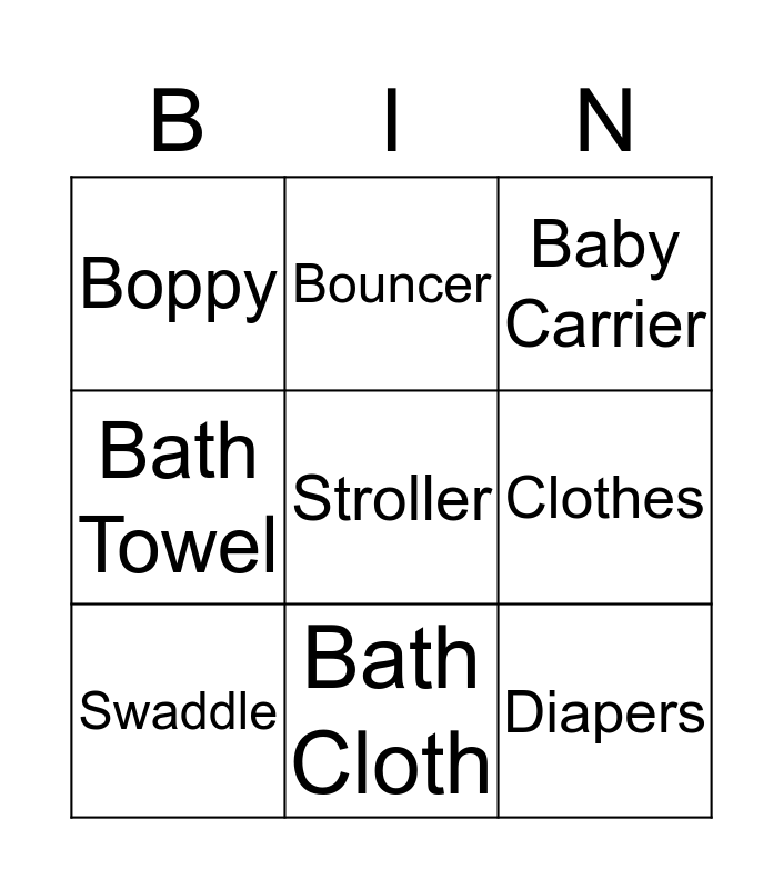 This bingo card has a free space and 8 words: Clothes, Baby Carrier, Bouncer, Swaddle, Boppy, Diapers, Bath Towel and Bath Cloth.