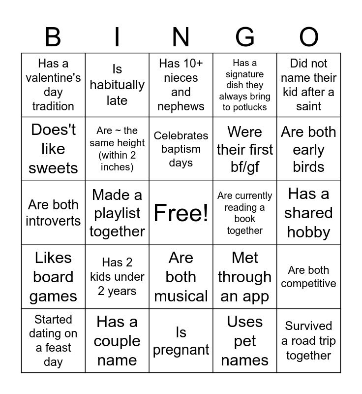 This bingo card has a free space and 29 words: Started dating on a feast day, Has a height differential of 12 inches or more, Made a playlist together, Is currently watching a show together, Has a valentine's day tradition, Has 10+ nieces and nephews, Are ~ the same height (within 2 inches), Has 2 kids under 2 years, Are currently reading a book together, Has a couple name, Has a shared hobby, Survived a road trip together, Is pregnant, Uses pet names, Are both early birds, Has 3+ godchildren, Are both musical, Likes board games, Did not name their kid after a saint, Are both introverts, Met through an app, Likes hosting themed parties, Were their first bf/gf, Does't like sweets, Has a signature dish they always bring to potlucks, Is habitually late, Are both competitive, Celebrates baptism days and Traveled internationally in the last year together.