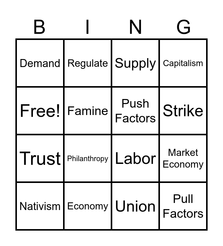 This bingo card has 16 words: Economy, Market Economy, Supply, Demand, Trust, Regulate, Labor, Union, Free!, Famine, Nativism, Capitalism, Philanthropy, Strike, Push Factors and Pull Factors.