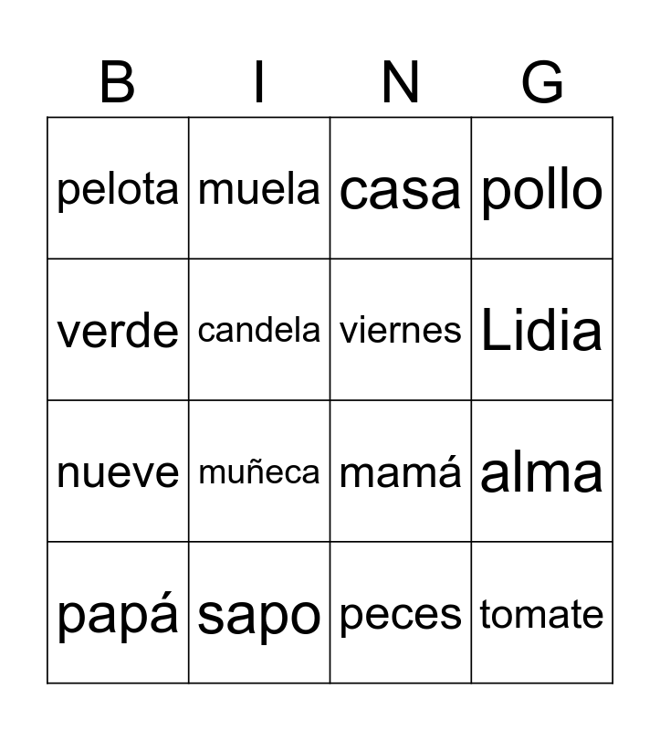 This bingo card has 44 words: momia, papá, paleta, cinco, nariz, tiza, casa, ojos, verde, mano, pollo, sapo, techo, lechuga, hotel, pepino, vaca, mamá, pan, muñeca, muela, maceta, queso, pelota, patio, peces, pasta, isla, pasos, tomate, elote, Emilia, sol, papel, alma, coco, Paco, aceite, Lidia, candela, nueve, jueves, viernes and banano.