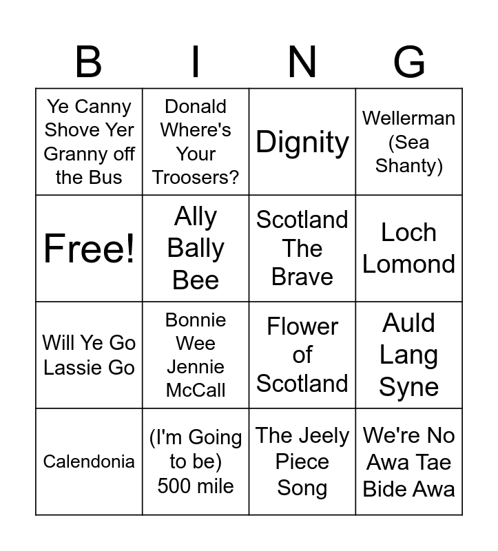 This bingo card has 16 words: (I'm Going to be) 500 mile, Auld Lang Syne, Dignity, Ye Canny Shove Yer Granny off the Bus, Will Ye Go Lassie Go, Donald Where's Your Troosers?, Flower of Scotland, The Jeely Piece Song, Free!, Ally Bally Bee, Calendonia, Wellerman (Sea Shanty), Bonnie Wee Jennie McCall, Loch Lomond, Scotland The Brave and We're No Awa Tae Bide Awa.