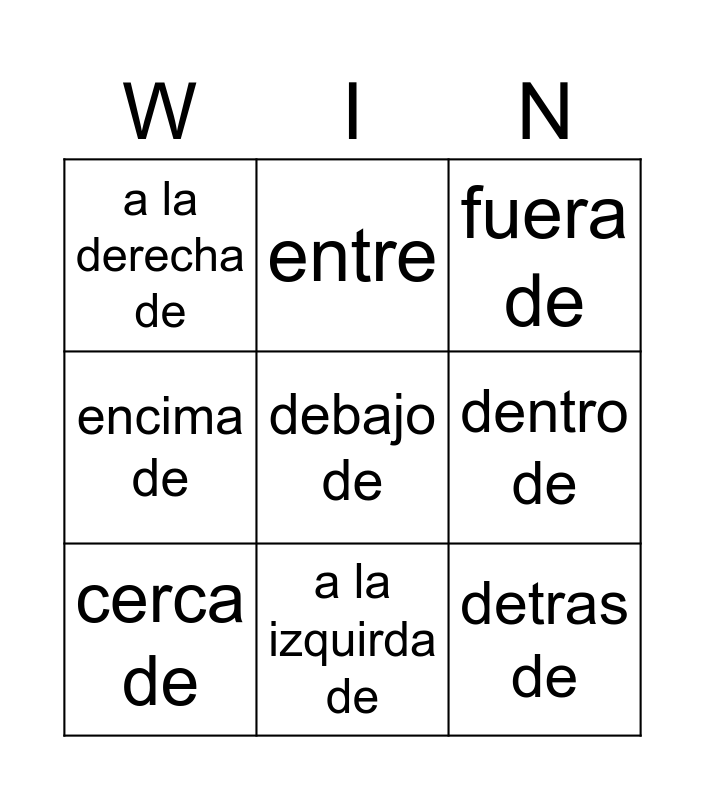 This bingo card has 14 words: al lado de, lejos de, cerca de, entre, encima de, debajo de, detras de, enfrente de, a la izquirda de, a la derecha de, en, dentro de, fuera de and sobre.