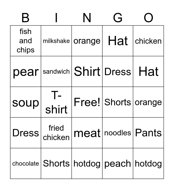 This bingo card has a free space and 115 words: Skirt, Dress, Shorts, Jacket, Jeans, Sweater, Hat, Shirt, T-shirt, Jeans, Socks, Pants, chicken, egg, honey, ice-cream, meat, salad, sandwich, soup, chocolate, orange, peach, pear, Skirt, Dress, Shorts, Jacket, Jeans, Sweater, Hat, Shirt, T-shirt, Jeans, Socks, Pants, chicken, egg, honey, ice-cream, meat, salad, sandwich, soup, chocolate, orange, peach, pear, kiwi, Skirt, Dress, Shorts, Jacket, Jeans, Sweater, Hat, Shirt, T-shirt, Jeans, Socks, Pants, chicken, egg, honey, ice-cream, meat, salad, sandwich, soup, chocolate, orange, peach, pear, hamburger, french fries, hotdog, fried chicken, fish and chips, pie, sushi, egg roll, milkshake, donuts, noodles, Dress, Shorts, Jacket, Jeans, Sweater, Hat, Shirt, T-shirt, Socks, Pants, chicken, egg, Honey, ice-cream, meat, salad, sandwich, soup, chocolate, orange, peach, pear, hamburger, french fries, hotdog, pie, sushi, egg roll, milkshake, donuts and noodles.