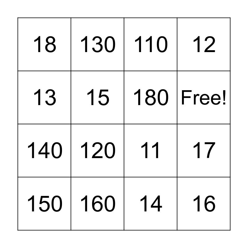 This bingo card has 17 words: 14, 150, 110, 18, 120, 12, 17, 180, Free!, 15, 160, 11, 13, 130, 140, 170 and 16.