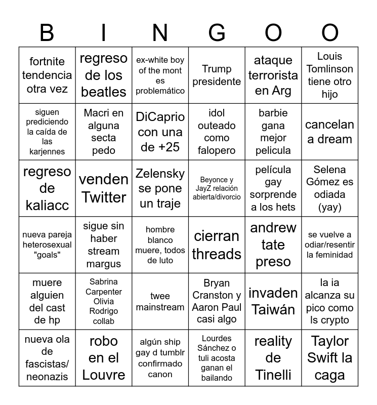 This bingo card has 36 words: Bryan Cranston y Aaron Paul casi algo, twee mainstream, Lourdes Sánchez o tuli acosta ganan el bailando, siguen prediciendo la caída de las karjennes, nueva pareja heterosexual "goals", Beyonce y JayZ relación abierta/divorcio, Macri en alguna secta pedo, algún ship gay d tumblr confirmado canon, ataque terrorista en Arg, invaden Taiwán, cancelan a dream, Trump presidente, la ia alcanza su pico como ls crypto, venden Twitter, idol outeado como falopero, fortnite tendencia otra vez, muere alguien del cast de hp, película gay sorprende a los hets, regreso de kaliacc, ex-white boy of the mont es problemático, Zelensky se pone un traje, sigue sin haber stream margus, cierran threads, hombre blanco muere, todos de luto, andrew tate preso, regreso de los beatles, barbie gana mejor pelicula, robo en el Louvre, DiCaprio con una de +25, Louis Tomlinson tiene otro hijo, Taylor Swift la caga, nueva ola de fascistas/ neonazis, se vuelve a odiar/resentir la feminidad, Selena Gómez es odiada (yay), Sabrina Carpenter Olivia Rodrigo collab and reality de Tinelli.