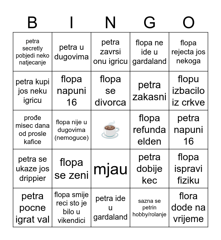 This bingo card has a free space and 24 words: petra pocne igrat val, flopa se zeni, flopa se divorca, sazna se petrin hobby/rolanje, flopa rejecta jos nekoga, petra secretly pobjedi neko natjecanje, petra u dugovima, petra zavrsi onu igricu, flopa refunda elden, petra napuni 16, prođe misec dana od prosle kafice, flopa napuni 16, petra dobije kec, flopa ispravi fiziku, petra kupi jos neku igricu, flopa smije reci sto je bilo u vikendici, petra ide u gardaland, flopa ne ide u gardaland, flopu izbacilo iz crkve, petra se ukaze jos drippier, flopa nije u dugovima (nemoguce), mjau, petra zakasni and flora dode na vrijeme.