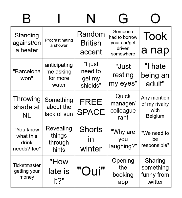 This bingo card has a free space and 24 words: Revealing things through hints, "How late is it?", "I just need to get my shields", Ticketmaster getting your money, Took a nap, Standing against/on a heater, "Barcelona won", Procrastinating a shower, Quick manager/ colleague rant, Shorts in winter, "Just resting my eyes", Throwing shade at NL, "Why are you laughing?", "We need to be responsible", anticipating me asking for more water, Opening the booking app, Any mention of my rivalry with Belgium, Random British accent, "I hate being an adult", Something about the lack of sun, Sharing something funny from twitter, "You know what this drink needs? Ice", Someone had to borrow your car/get driven somewhere and "Oui".