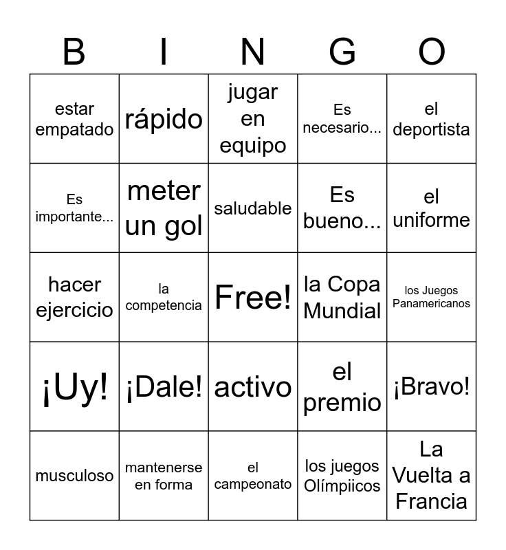 This bingo card has a free space and 31 words: el campeonato, el ciclismo, la competencia, competir, estar empatado, jugar en equipo, meter un gol, el premio, la Copa Mundial, los juegos Olímpiicos, los Juegos Panamericanos, La Vuelta a Francia, la pista, la red, el uniforme, ¡Ay por favor!, ¡Bravo!, ¡Dale!, ¡Uy!, activo, el deportista, lento, musculoso, rápido, Es bueno..., Es importante..., Es necesario..., hacer ejercicio, mantenerse en forma, saludable and seguir una dieta balanceada.