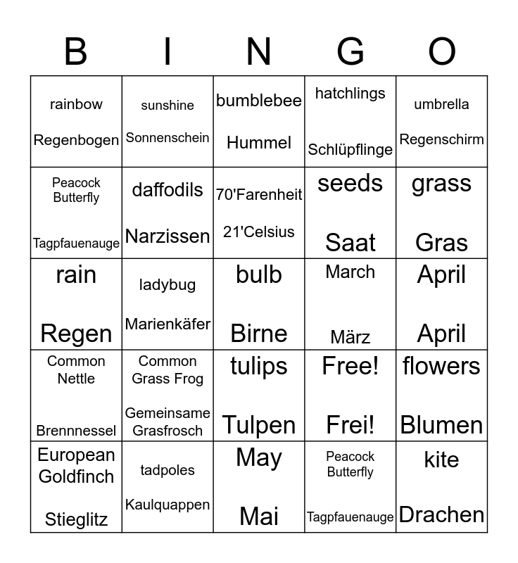 This bingo card has 25 words: Common Grass Frog Gemeinsame Grasfrosch, May Mai, 70'Farenheit 21'Celsius, European Goldfinch Stieglitz, umbrella Regenschirm, rainbow Regenbogen, Peacock Butterfly Tagpfauenauge, sunshine Sonnenschein, March März, tulips Tulpen, seeds Saat, rain Regen, Free! Frei!, flowers Blumen, daffodils Narzissen, kite Drachen, April April, bumblebee Hummel, grass Gras, ladybug Marienkäfer, bulb Birne, tadpoles Kaulquappen, Common Nettle Brennnessel, hatchlings Schlüpflinge and Peacock Butterfly Tagpfauenauge.