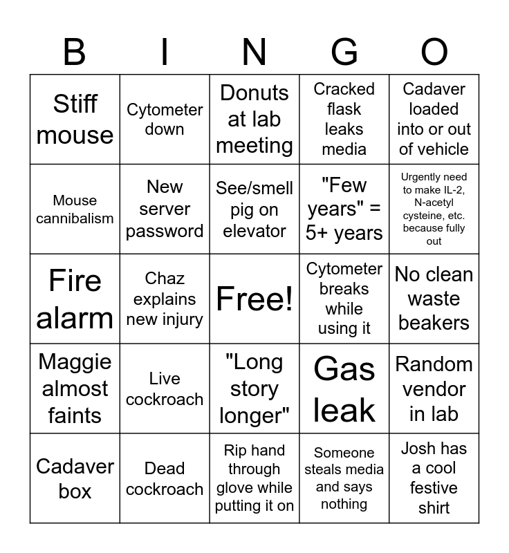 This bingo card has a free space and 24 words: Live cockroach, Dead cockroach, See/smell pig on elevator, Cadaver box, Cadaver loaded into or out of vehicle, Stiff mouse, Mouse cannibalism, Cytometer down, Cytometer breaks while using it, "Long story longer", "Few years" = 5+ years, Fire alarm, Gas leak, Random vendor in lab, New server password, Someone steals media and says nothing, No clean waste beakers, Donuts at lab meeting, Urgently need to make IL-2, N-acetyl cysteine, etc. because fully out, Chaz explains new injury, Josh has a cool festive shirt, Maggie almost faints, Cracked flask leaks media and Rip hand through glove while putting it on.