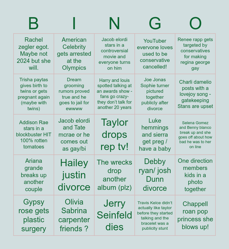 This bingo card has a free space and 24 words: Gypsy rose gets plastic surgery, Hailey justin divorce, Harry and louis spotted talking at an awards show - fans go crazy- they don’t talk for another 20 years, Travis Kelce didn’t actually like taylor before they started talking and the bracelet was a publicity stunt, Renee rapp gets targeted by conservatives for making regina george gay, Rachel zegler egot. Maybe not 2024 but she will., American Celebrity gets arrested at the Olympics, Jacob elordi stars in a controversial movie and everyone turns on him, Luke hemmings and sierra get preg / have a baby, Selena Gomez and Benny blanco break up and she goes off about how bad he was to her on line, Addison Rae stars in a blockbuster HIT 100% rotten tomatoes, Dream grooming rumors proved true and he goes to jail for ewwww, Debby ryan/ josh Dunn divorce, One direction members kids in a photo together, Trisha paytas gives birth to twins or gets pregnant again (maybe with twins), Olivia Sabrina carpenter friends ?, Jerry Seinfeld dies, YouTuber evervone loves used to be conservative cancelled!, Charli damelio posts with a lovejoy song - gatekeeping Stans are upset, Ariana grande breaks up another couple, Jacob elordi and Tate mcrae or he comes out as gay/bi, The wrecks drop another album (plz), Joe Jonas Sophie turner pictured together publicly after divorce and Chappell roan pop princess she blows up!.