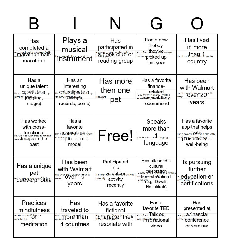 This bingo card has 24 images, a free space and 24 words: Has been with Walmart over 10 years, Has traveled to more than 4 countries, Has more then one pet, Practices mindfulness or meditation, Has lived in more than 1 country, Has completed a marathon/half-marathon, Has a unique talent or skill (e.g. juggling, magic), Plays a musical instrument, Speaks more than 1 language, Participated in a volunteer activity recently, Has a favorite finance-related podcast they recommend, Has worked with cross-functional teams in the past, Has attended a cultural celebration here at Walmart (e.g. Diwali, Hanukkah), Is pursuing further education or certifications, Has an interesting collection (e.g. stamps, records, coins), Has a favorite TED Talk or inspirational video, Has a favorite app that helps with productivity or well-being, Has participated in a book club or reading group, Has been with Walmart over 20 years, Has a favorite inspirational figure or role model, Has presented at a financial conference or seminar, Has a unique pet peeve/phobia, Has a new hobby they've picked up this year and Has a favorite fictional character they resonate with.