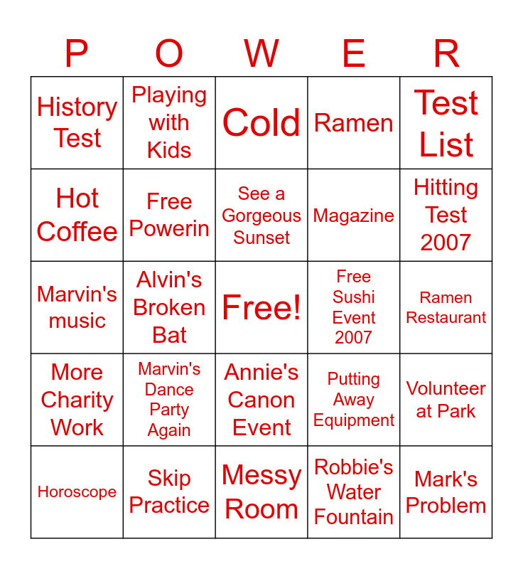 This bingo card has a free space and 83 words: Car Ride, Catch With Robin, Cold, Dance Party, Dandelion House, Dirty Baseballs, Dr. Goodjob Events 2007, Dragonfish, Fan Letter, Favorite Team on TV, Someone in Trouble, Filthy Shirt, Free Powerin, Free Sushi Event 2007, Global Warming, History Test, Horoscope, Hot Coffee, Wanna buy insurance?, Lost Practice Match, Lucky Lottery, Magazine, Mark's Problem, Marvin Late, Alvin's Broken Bat, Becky's Cheese Cake, Becky's Sandwiches, Bookworm Questions, California Event 2007, Marvin's Burger, Marvin's Dance Party Again, Marvin's Hot Dogs, Marvin's Loan, Marvin's music, Marvin's Tacos, Messy Locker Room, Messy Room, MLB Player, Hitting Test 2007, More Charity Work, New York Event 2007, Nightmare, Peter's Batting Stance, Peter's Investment Plan, Pitching Test 2007, Playing Catch, Playing with Kids, Pocket Money, Practice Negotiations, Professor's Homework, Putting Away Equipment, Ramen, Ramen Restaurant, Rex's Jewelry Stand, Robbie's Leadership, Robbie's New Job, Robin's Pumpkins, Rock Paper Scissors, Skip Practice, Steakhouse Event 2007, Stolen Bag, Stolen Purse, Suspense 23, Test List, Toby's Party, Volunteer at Park, Waiter Memory Test, Dad's in the Money, Dad NEEDS the Money, Show him the real you., Dad's Training Event, Becky's Training Event, Shady Acessories, Annie's Canon Event, Robbie's Water Fountain, Robin's Water Fountain, Catch some Z's!, See a Gorgeous Sunset, Practice in the Park, A book on Baseball Practices!, Made money, did study, That's our motto and Heavy Traffic.