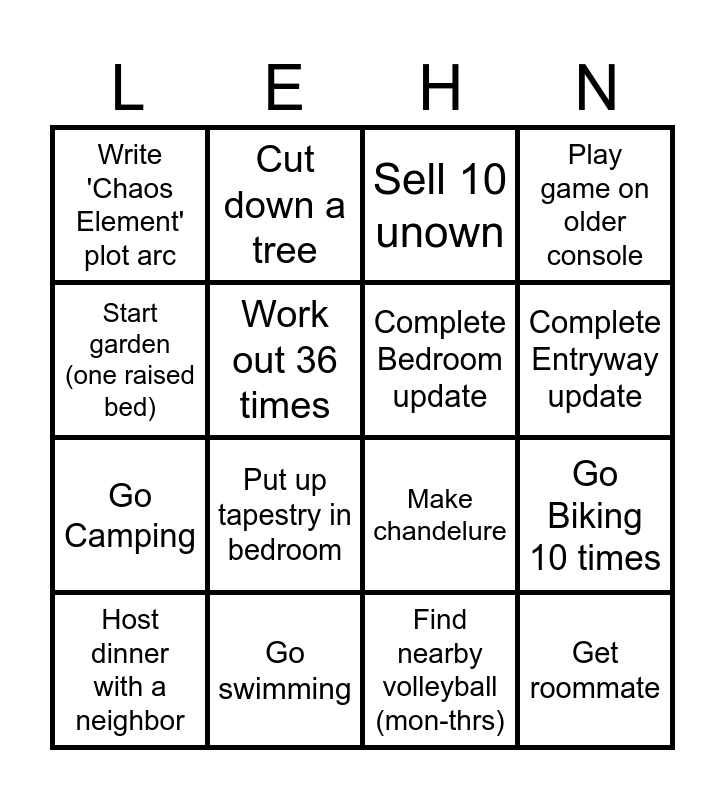 This bingo card has 16 words: Go swimming, Go Biking 10 times, Sell 10 unown, Write 'Chaos Element' plot arc, Go Camping, Cut down a tree, Make chandelure, Find nearby volleyball (mon-thrs), Start garden (one raised bed), Work out 36 times, Host dinner with a neighbor, Play game on older console, Put up tapestry in bedroom, Complete Entryway update, Complete Bedroom update and Get roommate.