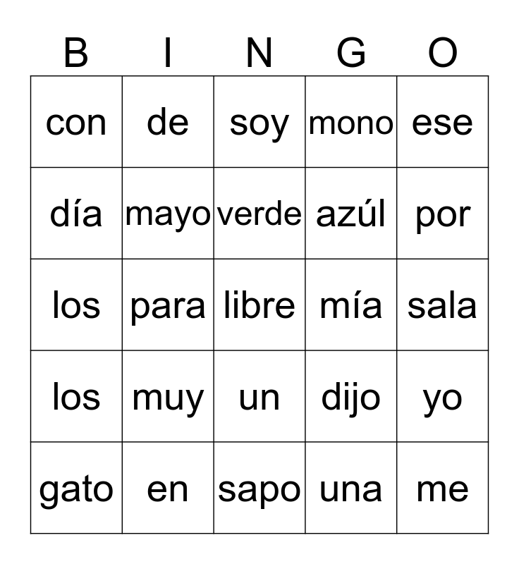 This bingo card has a free space and 24 words: muy, en, verde, gato, ese, con, día, de, mía, un, azúl, los, dijo, yo, mayo, una, sala, soy, por, para, me, los, mono and sapo.