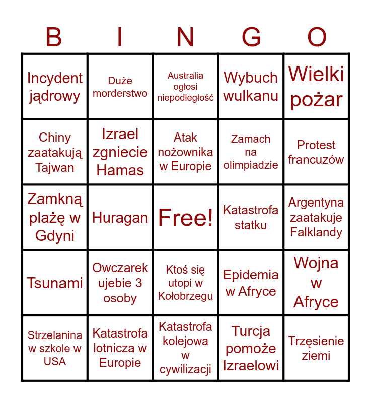 This bingo card has a free space and 24 words: Owczarek ujebie 3 osoby, Katastrofa lotnicza w Europie, Atak nożownika w Europie, Strzelanina w szkole w USA, Wielki pożar, Incydent jądrowy, Chiny zaatakują Tajwan, Duże morderstwo, Katastrofa statku, Ktoś się utopi w Kołobrzegu, Zamach na olimpiadzie, Zamkną plażę w Gdyni, Epidemia w Afryce, Wojna w Afryce, Izrael zgniecie Hamas, Turcja pomoże Izraelowi, Argentyna zaatakuje Falklandy, Australia ogłosi niepodległość, Protest francuzów, Huragan, Trzęsienie ziemi, Tsunami, Wybuch wulkanu and Katastrofa kolejowa w cywilizacji.