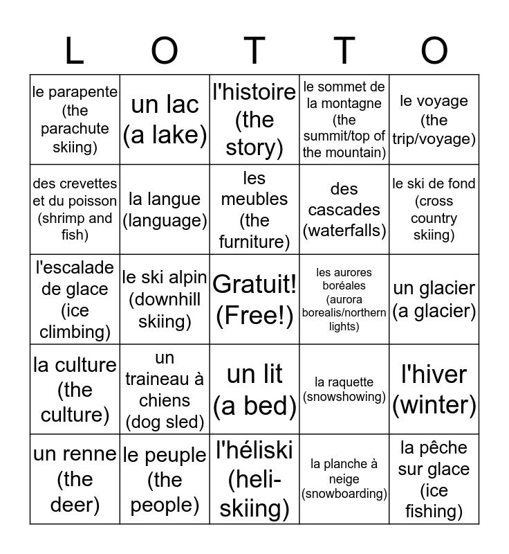 This bingo card has a free space and 24 words: un traineau à chiens (dog sled), le peuple (the people), les meubles (the furniture), un renne (the deer), le voyage (the trip/voyage), le parapente (the parachute skiing), des crevettes et du poisson (shrimp and fish), un lac (a lake), les aurores boréales (aurora borealis/northern lights), un lit (a bed), des cascades (waterfalls), l'escalade de glace (ice climbing), la raquette (snowshowing), l'hiver (winter), la langue (language), la planche à neige (snowboarding), un glacier (a glacier), l'histoire (the story), le ski de fond (cross country skiing), le ski alpin (downhill skiing), la pêche sur glace (ice fishing), la culture (the culture), le sommet de la montagne (the summit/top of the mountain) and l'héliski (heli-skiing).