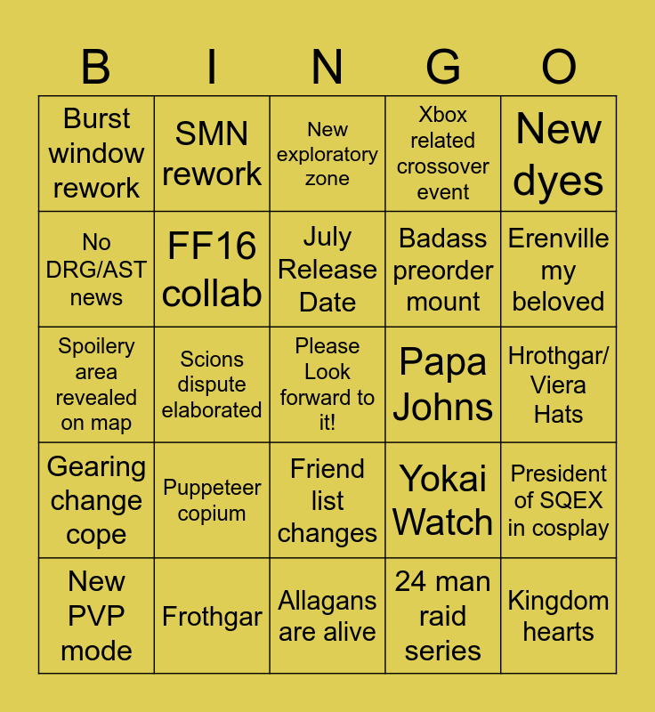 This bingo card has a free space and 24 words: Puppeteer copium, Frothgar, July Release Date, New PVP mode, New dyes, Burst window rework, No DRG/AST news, SMN rework, Papa Johns, Friend list changes, Badass preorder mount, Spoilery area revealed on map, Yokai Watch, President of SQEX in cosplay, FF16 collab, 24 man raid series, Hrothgar/ Viera Hats, New exploratory zone, Erenville my beloved, Scions dispute elaborated, Kingdom hearts, Gearing change cope, Xbox related crossover event and Allagans are alive.