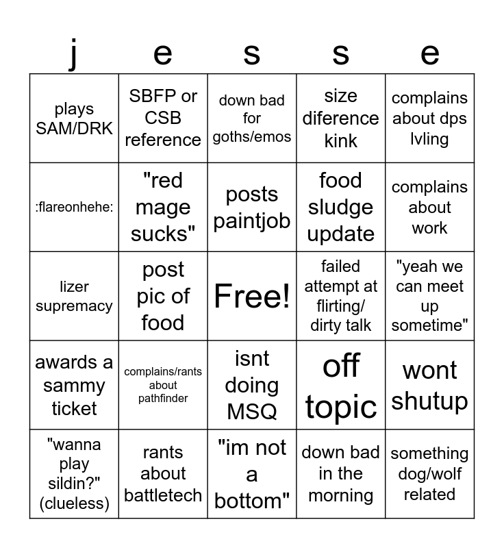 This bingo card has a free space and 24 words: complains/rants about pathfinder, rants about battletech, posts paintjob, "wanna play sildin?" (clueless), complains about dps lvling, plays SAM/DRK, :flareonhehe:, SBFP or CSB reference, failed attempt at flirting/ dirty talk, isnt doing MSQ, food sludge update, lizer supremacy, off topic, wont shutup, "red mage sucks", down bad in the morning, "yeah we can meet up sometime", down bad for goths/emos, complains about work, post pic of food, something dog/wolf related, awards a sammy ticket, size diference kink and "im not a bottom".