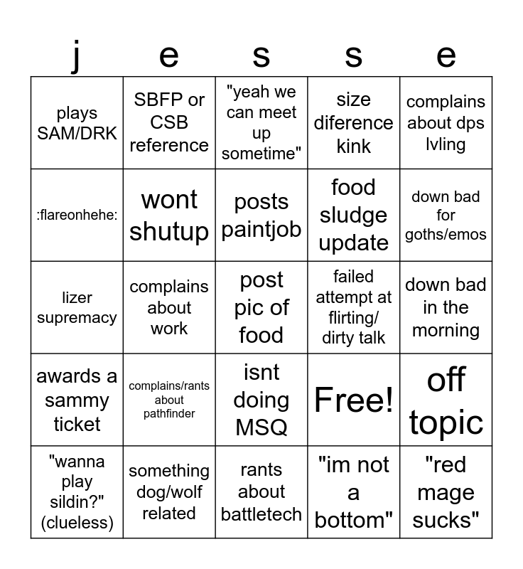 This bingo card has 25 words: complains/rants about pathfinder, rants about battletech, posts paintjob, "wanna play sildin?" (clueless), complains about dps lvling, plays SAM/DRK, :flareonhehe:, SBFP or CSB reference, failed attempt at flirting/ dirty talk, isnt doing MSQ, food sludge update, lizer supremacy, Free!, off topic, wont shutup, "red mage sucks", down bad in the morning, "yeah we can meet up sometime", down bad for goths/emos, complains about work, post pic of food, something dog/wolf related, awards a sammy ticket, size diference kink and "im not a bottom".