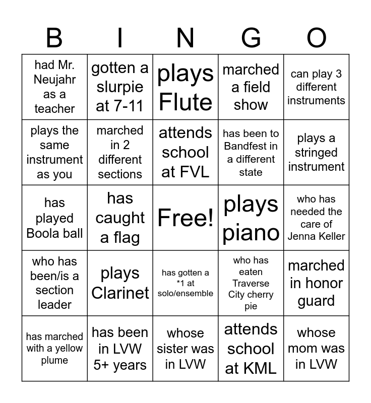 This bingo card has a free space and 44 words: plays Trombone, whose mom was in LVW, is in a jazz band, has marched with a yellow plume, has never slept on a gym floor, attends school at KML, plays Flute, had German class with Mr. Schmandt, can play 3 different instruments, has been in LVW 5+ years, marched a field show, plays piano, has gotten a *1 at solo/ensemble, plays Clarinet, plays Trumpet, whose sister was in LVW, plays French Horn, has played Boola ball, directed a song, plays a stringed instrument, gotten a slurpie at 7-11, attends school at Luther Prep, whose brother was in LVW, had Mr. Neujahr as a teacher, played in Pit Orchestra, who has needed the care of Jenna Keller, whose father was in LVW, played a solo in band, who has eaten Traverse City cherry pie, who has been/is a section leader, marched a parade in West Bend, marched in honor guard, has baked with Miss Scharf, has forgotten to bring their instrument to a concert/parade, has caught a flag, has played at church, worn 3 different LVW uniforms, has marched backward, attends school at FVL, plays the same instrument as you, has been to Bandfest in a different state, has never marched in a parade with an instrument, marched in 2 different sections and has caught something other than candy at a parade.