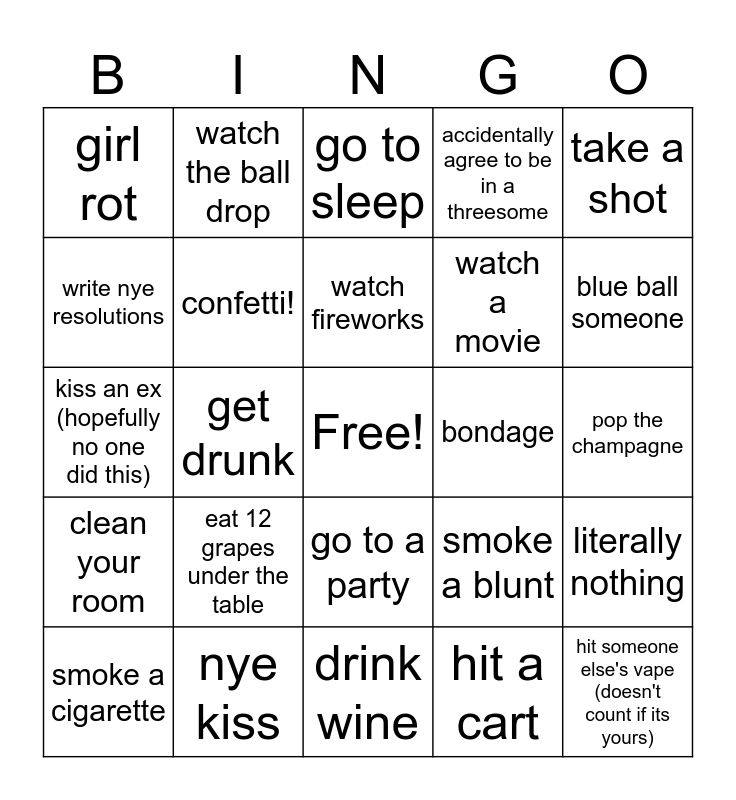 This bingo card has a free space and 24 words: eat 12 grapes under the table, nye kiss, watch fireworks, smoke a cigarette, take a shot, girl rot, write nye resolutions, watch the ball drop, bondage, go to a party, watch a movie, kiss an ex (hopefully no one did this), smoke a blunt, literally nothing, confetti!, hit a cart, pop the champagne, go to sleep, blue ball someone, get drunk, hit someone else's vape (doesn't count if its yours), clean your room, accidentally agree to be in a threesome and drink wine.