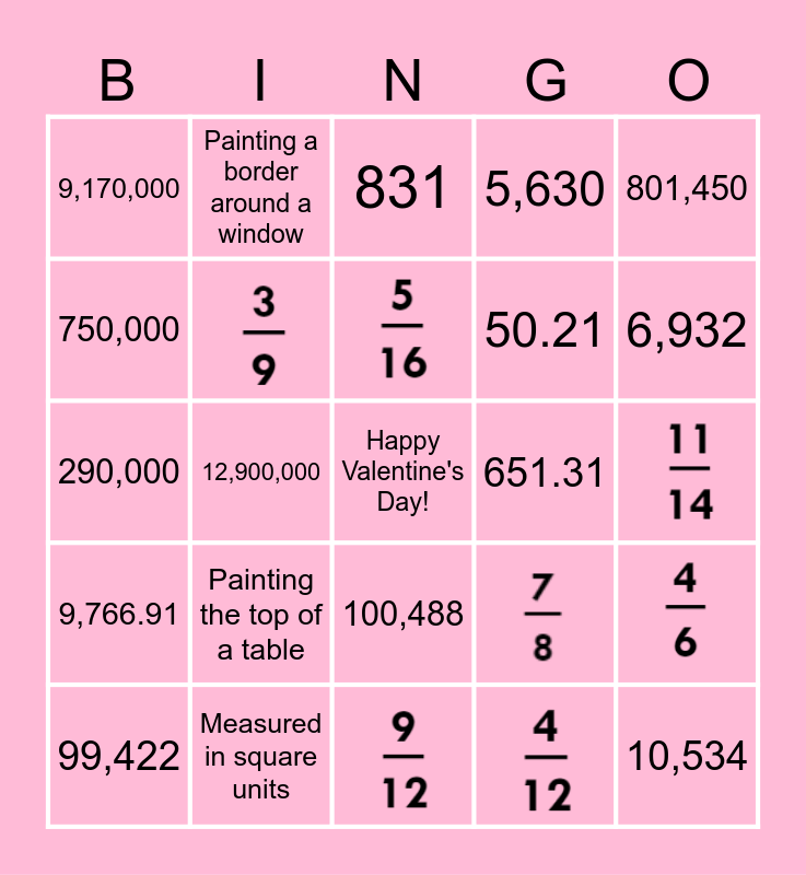 This bingo card has 12 images, a free space and 43 words: 5,600,000, 99,422, Building a fence, 9,170,000, Putting tile in your bathroom, 800,000, 50.21, 5,630, 32.12, 9,877,601.10, Building a picture frame, Putting carpet in your living room, 801,450, 12,900,000, 10,534, 651.31, 950,000, 831, 200,000, 1,700,000, 13,400,000, 1,640,000, 750,000, 290,000, 67.41, 9,766.91, 4,331.01, 493.61, Painting a border around a window, Putting tape around the outside of a door, Putting icing around the edge of a cake, Covering a canvas with paint, Painting the top of a table, Measured in square units, 7,555.18, 6,488.10, 7.1, 6,932, 88,532, 90,539, 6,422, 100,488 and 606,433.