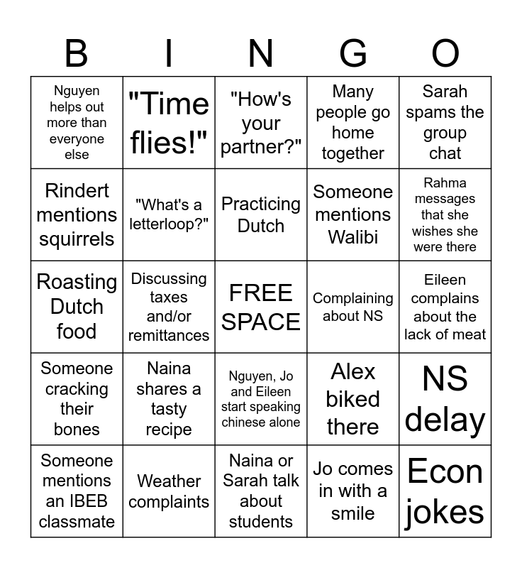 This bingo card has a free space and 30 words: Weather complaints, Someone is late because they're lost, Discussing taxes and/or remittances, "How's work?", Nguyen helps out more than everyone else, "How's your partner?", "What's a letterloop?", Nguyen, Jo and Eileen start speaking chinese alone, Complaining about NS, Naina or Sarah talk about students, Eileen complains about the lack of meat, Econ jokes, Jo comes in with a smile, "Long time no see!", Rahma messages that she wishes she were there, Azura takes a nap, Alex biked there, Someone cracking their bones, Naina shares a tasty recipe, Sarah spams the group chat, Roasting Dutch food, "How's inburgering going?", "Time flies!", Someone mentions Walibi, Rindert mentions squirrels, Many people go home together, NS delay, Someone mentions an IBEB classmate, Practicing Dutch and Rishant mentions passports.