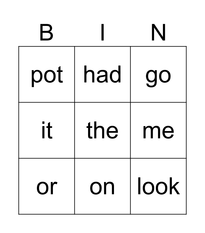 This bingo card has 27 words: one, no, look, two, me, go, had, can, she, he, not, it, dot, bat, rat, dog, or, on, mat, pot, to, and, of, cat, at, the and his.
