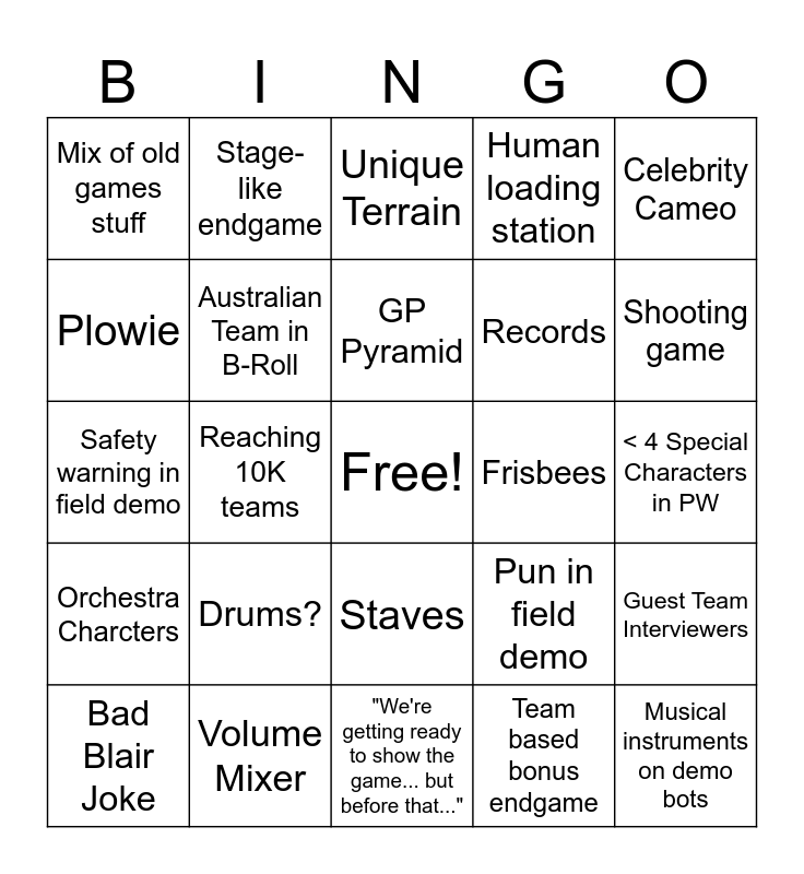 This bingo card has a free space and 24 words: Drums?, Volume Mixer, GP Pyramid, Bad Blair Joke, Celebrity Cameo, Mix of old games stuff, Plowie, Stage-like endgame, Frisbees, Staves, Records, Safety warning in field demo, Pun in field demo, Guest Team Interviewers, Australian Team in B-Roll, Team based bonus endgame, < 4 Special Characters in PW, Unique Terrain, Shooting game, Reaching 10K teams, Musical instruments on demo bots, Orchestra Charcters, Human loading station and "We're getting ready to show the game... but before that...".