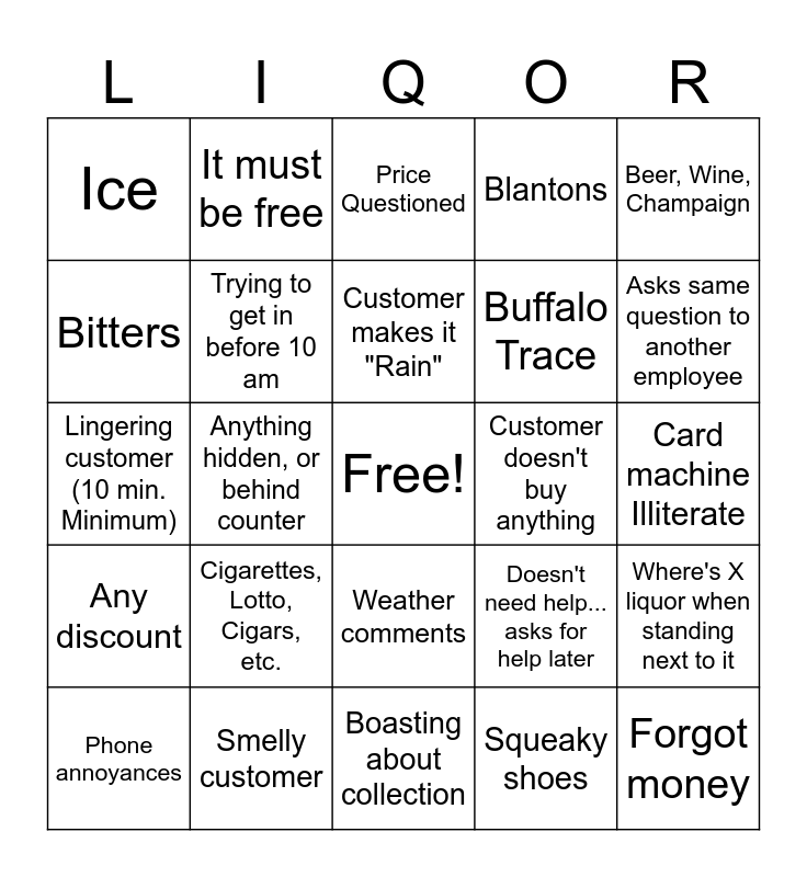 This bingo card has a free space and 64 words: Obnoxiously loud Customer, Comments about Working, Can you put it in a specific container(bags,boxes), Where's X liquor when standing next to it, Coins... you'll know, Dumb comments about I.D., It must be free, Shot Glasses, Customer makes it "Rain", Gift Cards/Bags, Weather comments, Restroom, Card machine Illiterate, Beer, Wine, Champaign, Comments about Music, Bitters, Anything hidden, or behind counter, Ice, Eagle Rare, Buffalo Trace, Cigarettes, Lotto, Cigars, etc., Any discount, Blantons, Non-alcoholic mixers, Bad Parking Job, P.O.S. Car, Leaves cart outside, Obnoxious amount of minis, Ask for trash can, Breaks bottle, Doesn't read 21 and over only sign, This is cheaper elsewhere, Anymore in the back?, Is this the only size?, Asks same question to another employee, Phone annoyances, Angry customer, Squeaky shoes, No shoes, Trying to get in before 10 am, Lingering customer (10 min. Minimum), Customer doesn't buy anything, Traffic comments, This isn't for me 'I don't drink', Bathing suit, Forgot money, Smelly customer, Licks fingers, Doesn't need help... asks for help later, Pappy, Weller, E.H. Taylor, Boasting about collection, When are deliveries?, Can't see without glasses, Brings in dog, Price Questioned, Not enough money, No shirt, Smacks machine with card, Singing, Headphones, earbuds, Whistling and Trying to get in after 9 pm.