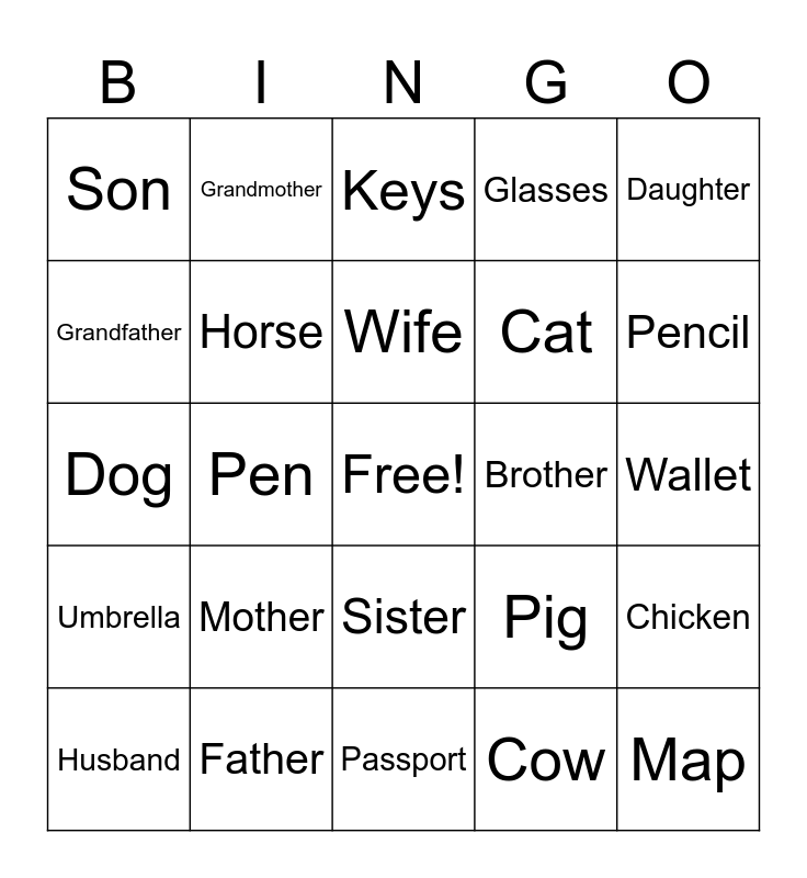 This bingo card has a free space and 24 words: Mother, Father, Wife, Husband, Daughter, Son, Grandfather, Grandmother, Brother, Sister, Cat, Dog, Pig, Chicken, Horse, Cow, Wallet, Keys, Pencil, Pen, Map, Umbrella, Glasses and Passport.