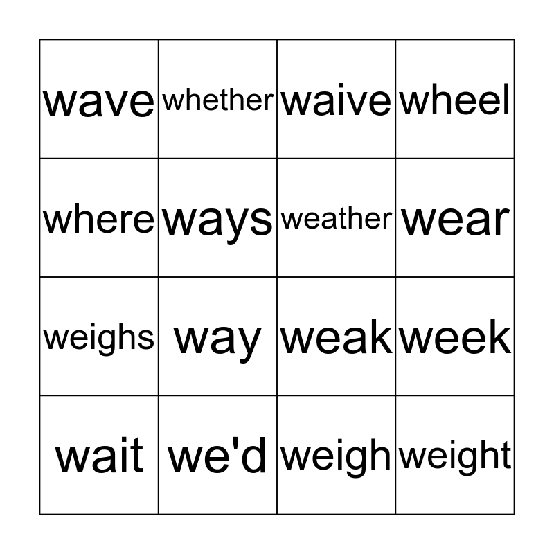 This bingo card has a free space and 15 words: wait, weight, waive, wave, wear, where, way, weigh, ways, weighs, week, wheel, weather, whether and we'd.