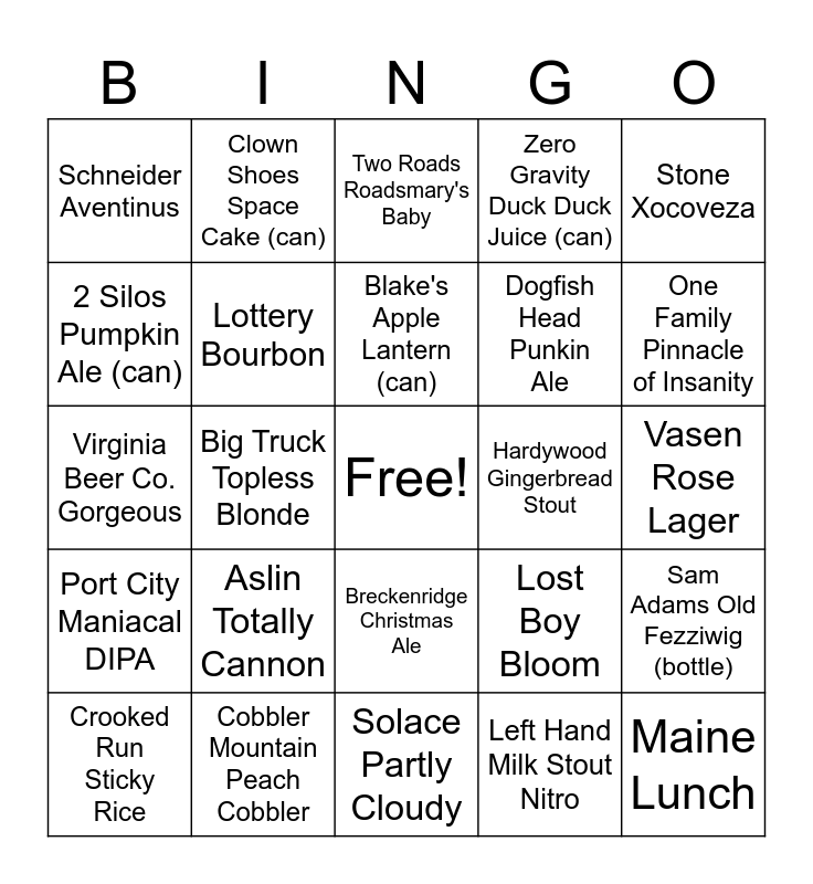 This bingo card has a free space and 29 words: Crooked Run Sticky Rice, Blue Mountain Dark Hollow, Big Truck Topless Blonde, Bell's Oberon Eclipse, Schneider Aventinus, Two Roads Roadsmary's Baby, Lottery Bourbon, Aslin Totally Cannon, Hardywood Gingerbread Stout, Cobbler Mountain Peach Cobbler, Vasen Rose Lager, Maine Lunch, Solace Partly Cloudy, Left Hand Milk Stout Nitro, One Family Pinnacle of Insanity, Winchester 522 Cider, Breckenridge Christmas Ale, Port City Maniacal DIPA, Stone Xocoveza, Virginia Beer Co. Gorgeous, Lost Boy Bloom, Hazelnut Espresso Martini, Dogfish Head Punkin Ale, 2 Silos Pumpkin Ale (can), Zero Gravity Duck Duck Juice (can), Clown Shoes Space Cake (can), Sam Adams Old Fezziwig (bottle), Blake's Apple Lantern (can) and Ommegang Gnommegang (can).